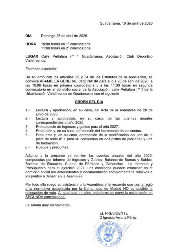 - Convocatoria Asamblea General Ordinaría del Club 2026